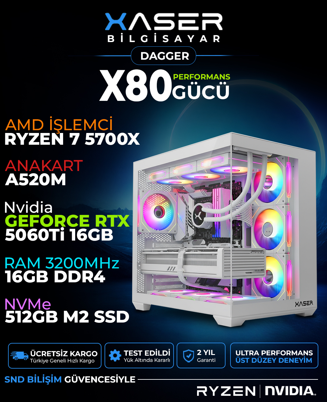 Xaser Dagger X80 Ryzen 7 5700X 16GB Ram 512GB M.2 NVMe SSD 16GB RTX5060 Ti Sıvı Soğutmalı Oyuncu Bilgisayarı