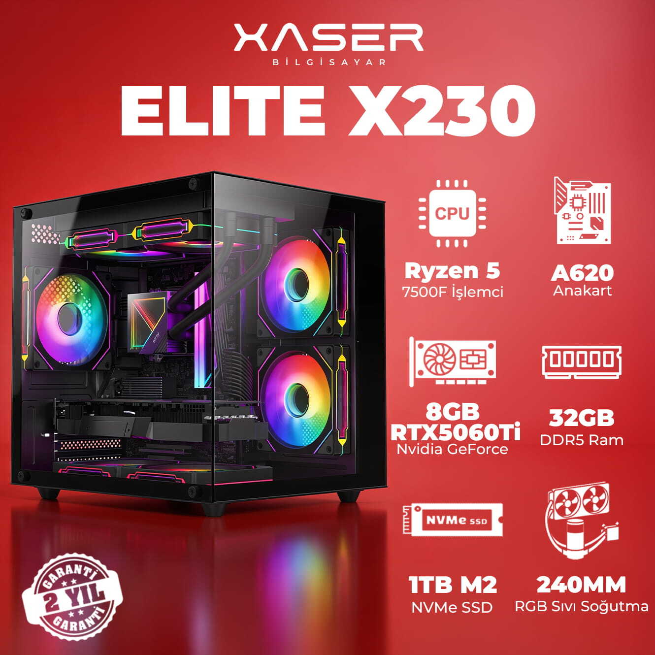 Xaser Elite X230 Ryzen 5 7500F 32GB DDR5 Ram 1TB M.2 NVMe SSD 8GB RTX5060 Ti Masaüstü Oyuncu Bilgisayarı