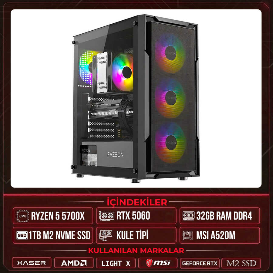 Xaser Light X10 Ryzen 7 5700X 32GB Ram 1TB M.2 NVMe SSD 8GB RTX5060 Masaüstü Oyuncu OEM Bilgisayar