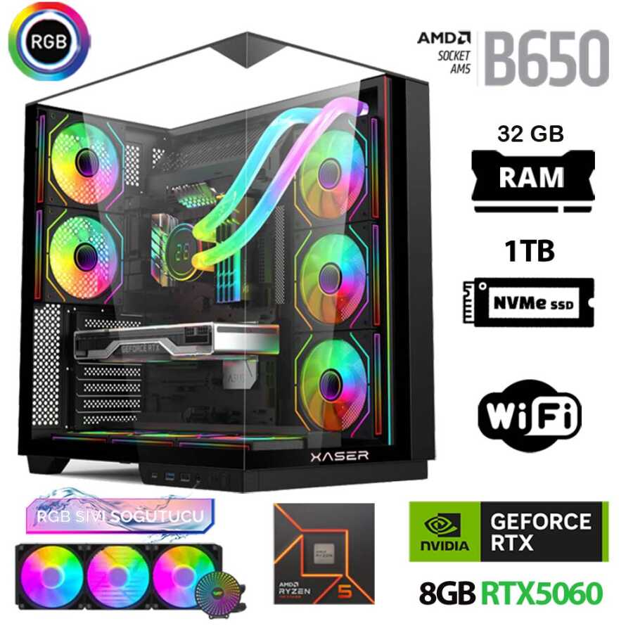 Xaser Queen X3 Ryzen 5 7500F 32GB Ram 1TB M.2 NVMe SSD 8GB RTX5060 Sıvı Soğutmalı Oyuncu Tavsiye Sistem