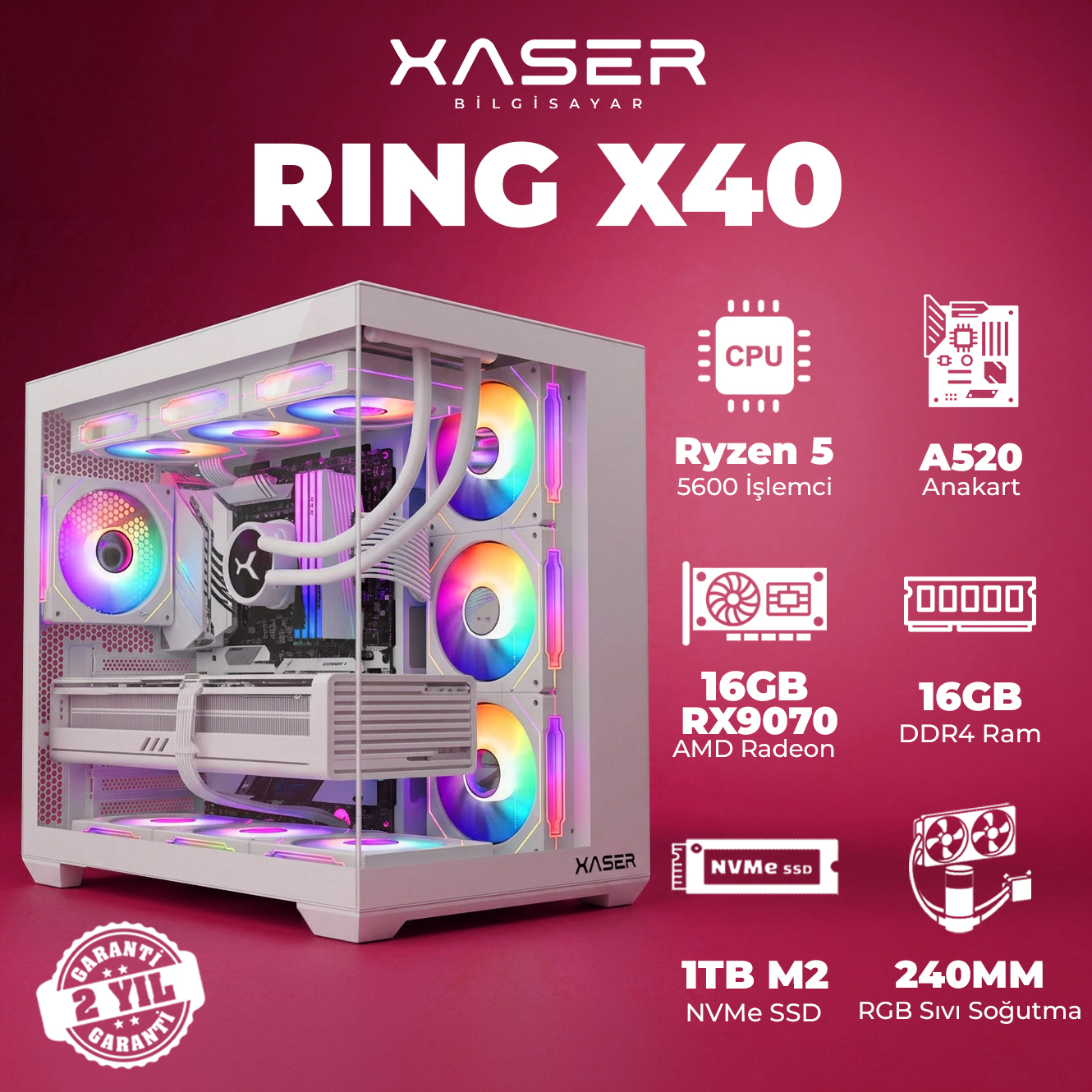 Xaser Ring X40 Ryzen 5 5600 16GB Ram 1TB M.2 NVMe SSD 8GB 16GB RX9070 Masaüstü Oyuncu Bilgisayarı