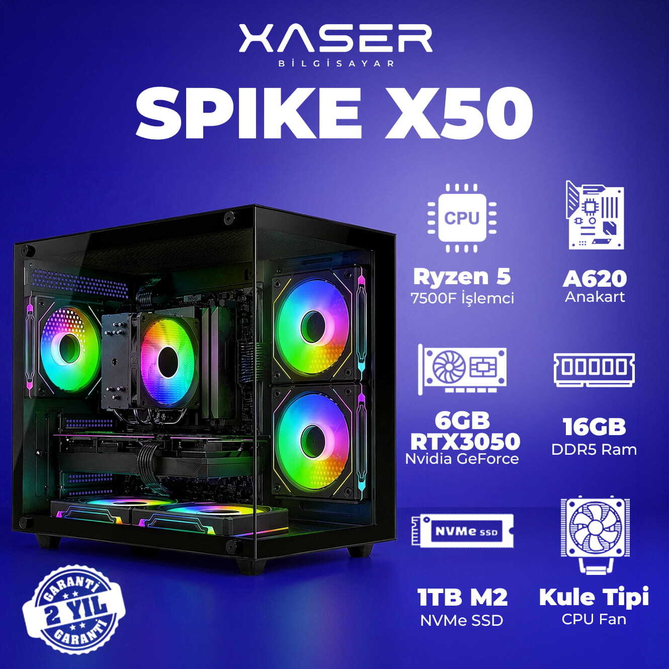 Xaser Spike X50 Ryzen 5 7500F 16GB DDR5 Ram 1TB M.2 NVMe SSD 6GB RTX3050 Masaüstü Oyuncu Bilgisayarı