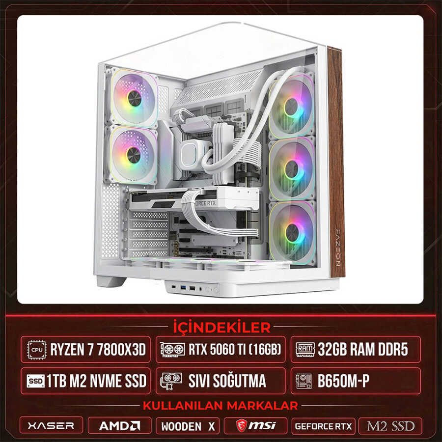 Xaser WOODEN X100 Ryzen 7 7800X3D 32GB DDR5 Ram 1TB M.2 NVMe SSD 16GB RTX5060 Ti Sıvı Soğutmalı Masaüstü Oyuncu OEM Bilgisayar