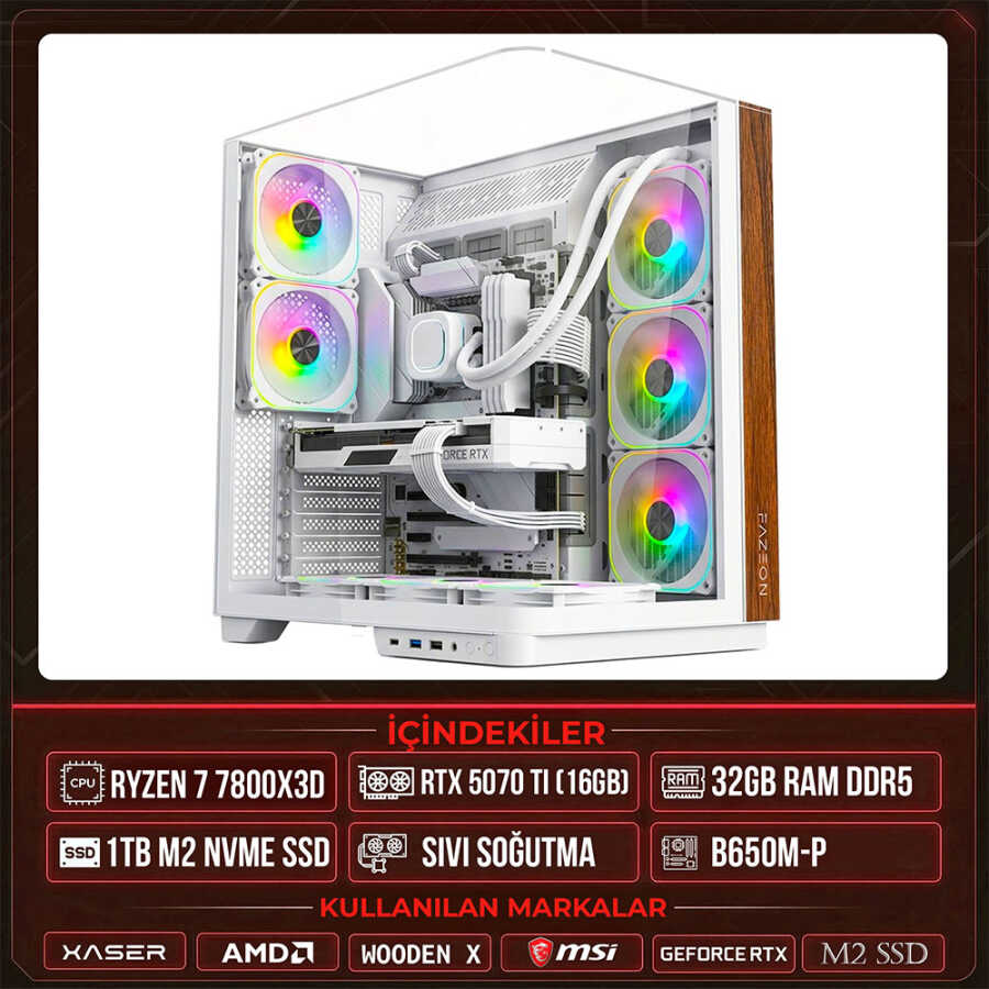 Xaser WOODEN X140 Ryzen 7 7800X3D 32GB DDR5 Ram 1TB M.2 NVMe SSD 16GB RTX5070 Ti Sıvı Soğutmalı Masaüstü Oyuncu OEM Bilgisayar