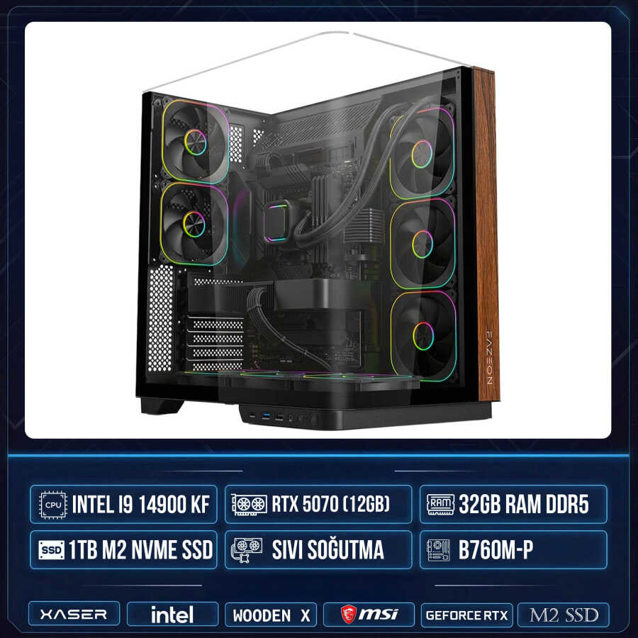 Xaser WOODEN X230 i9 14900KF 32GB DDR5 Ram 1TB M.2 NVMe SSD 12GB RTX5070 Sıvı Soğutmalı Masaüstü Oyuncu OEM Bilgisayar