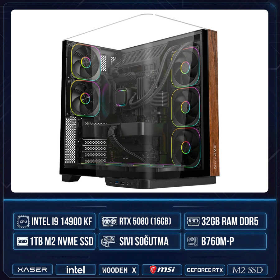 Xaser WOODEN X270 i9 14900KF 32GB DDR5 Ram 1TB M.2 NVMe SSD 16GB RTX5080 Sıvı Soğutmalı Masaüstü Oyuncu OEM Bilgisayar