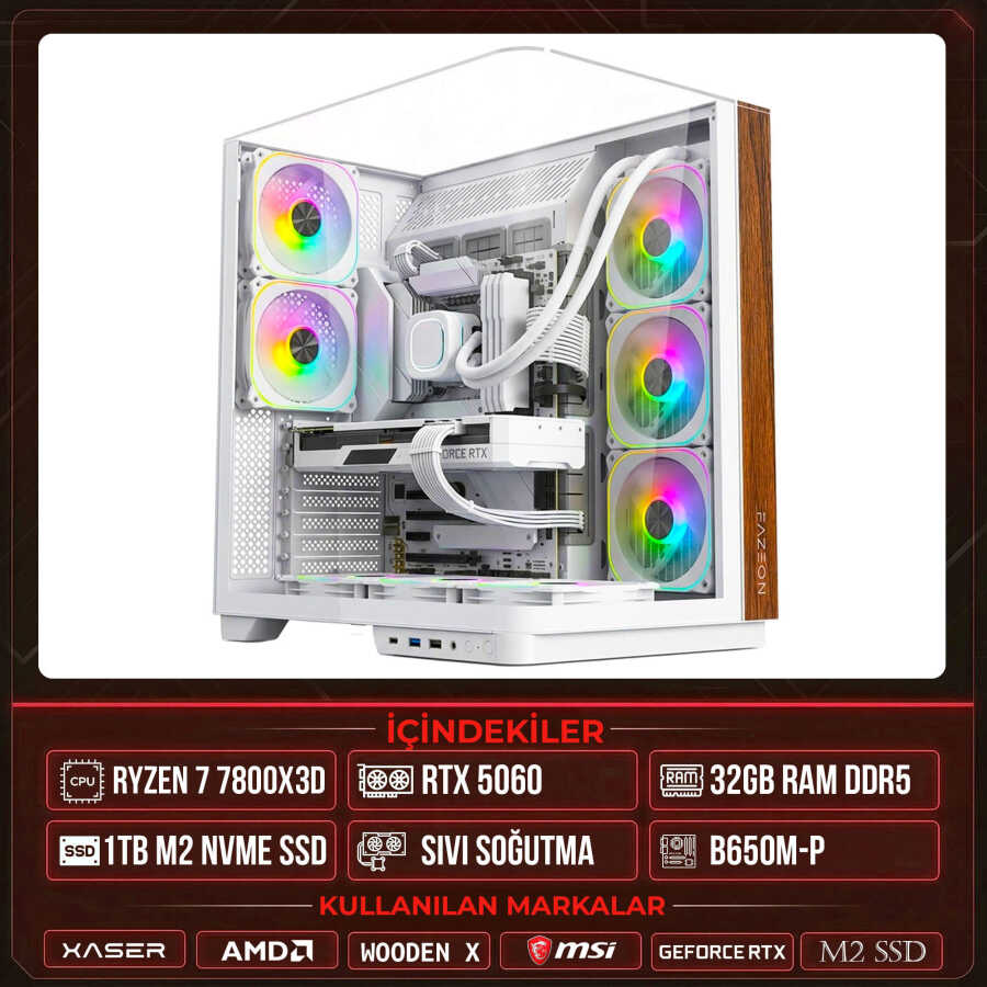 Xaser WOODEN X80 Ryzen 7 7800X3D 32GB DDR5 Ram 1TB M.2 NVMe SSD 8GB RTX5060 Sıvı Soğutmalı Masaüstü Oyuncu OEM Bilgisayar