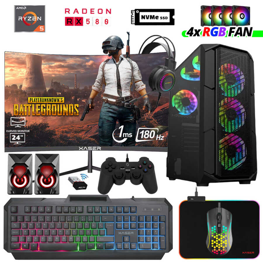 Xaser Xsr467 Ryzen 5 5600 16GB Ram 512GB M.2 NVMe SSD 8GB RX580 Ekran Kartı 24" Curved 180Hz Oyun Hazır Sistem