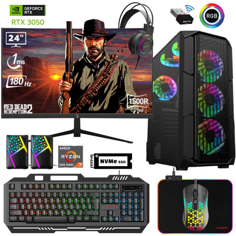 Xaser Xsr618 Ryzen 7 5700x 16GB Ram 1TB M.2 NVMe SSD 6GB RTX3050 24" Curved 180Hz Oyun Hazır Sistem