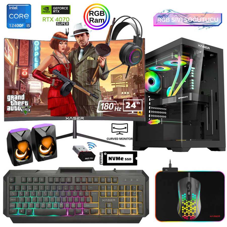 Xaser Xsr842 i5 12400F 16GB Ram 512GB M.2 NVMe SSD 12GB RTX4070 SUPER 24"Curved 180Hz Sıvı Soğutma Oyun Bilgisayarı