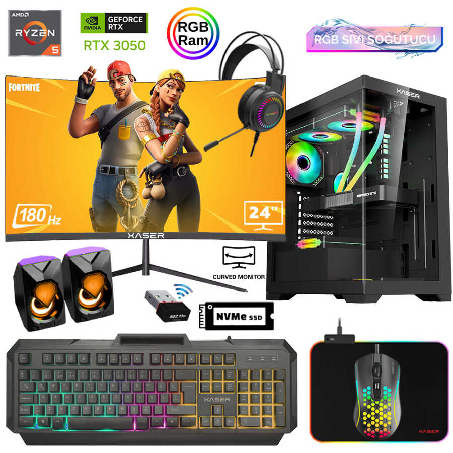 Xaser Xsr845 Ryzen 5 5600 16GB Ram 512GB M.2 NVMe SSD 6GB RTX3050 24" Curved 180Hz Sıvı Soğutma Oyun Hazır Sistem